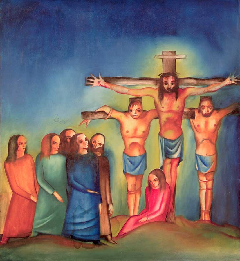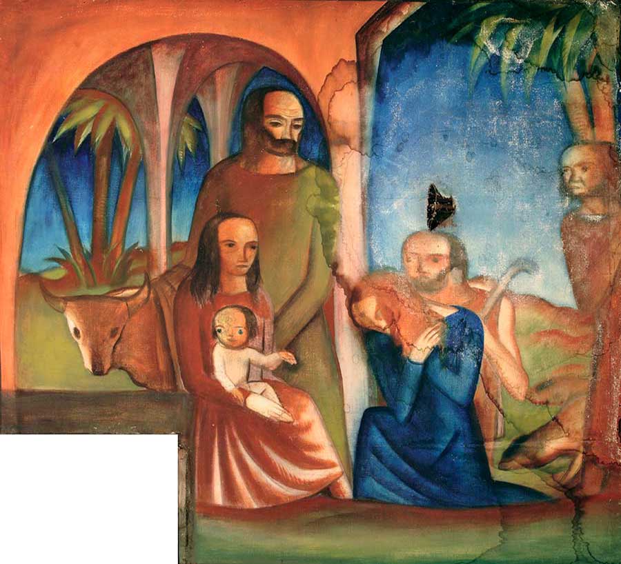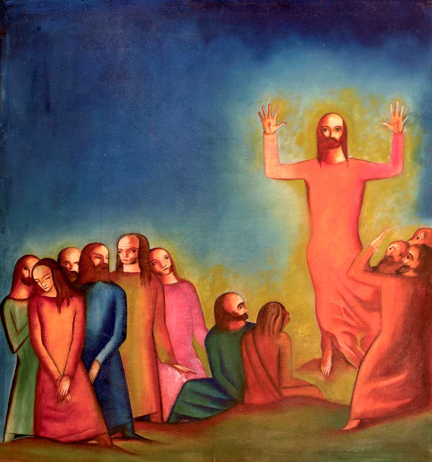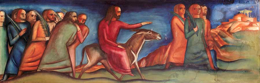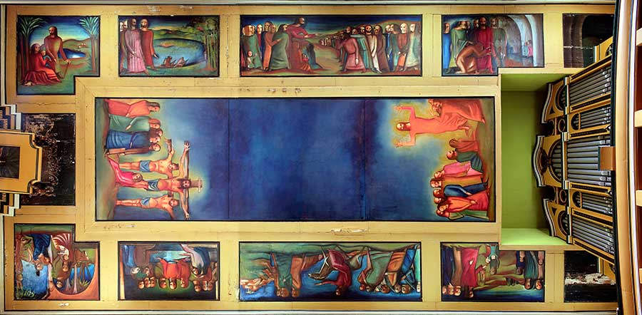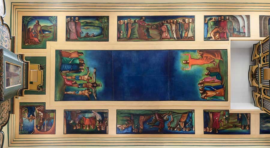 Im Mittelpunkt der Gestaltung stehen die dazu farblich kontrastierenden Deckenbilder. Sie zeigen Szenen aus dem Leben Jesu Christi. Im Mittelfeld stehen sich Kreuzigung und Himmelfahrt gegenüber. Je vier weitere Szenen aus dem Neuen Testament flankieren diese Darstellungen. Leuchtendes Lokalkolorit – Blau, Grün, Rot und tiefes Braun – prägt die Gemälde. Das tiefe Himmelsblau des Mittelfeldes findet sich in fast allen Gemälden wieder und dominiert in seiner entkörperlichten Strahlkraft den gesamten Kirchenraum. Warme Grüntöne durchziehen die landschaftlichen Bühnen der Einzelbilder, die lichten Rot- und Orangetöne sind den Gewändern vorbehalten. Auffällig sind die kontrastierenden, flächig aneinandergesetzten Farben und die überaus archaische Darstellung der Gestalten, die an die kubenhaften Gewandfiguren Giottos erinnern. Die zumeist nur durch Konturen gebauten, in lange Gewänder gehüllten Körper unterscheiden sich allein durch Haltung, Haartracht und Gesichter voneinander. Durch den radikalen Verzicht auf modisches Beiwerk und die Konzentration auf das seelische Erleben in den Gesichtern und in der Körperhaltung erlangen die Figuren eine über ihre Zeit hinausweisende Gültigkeit.↑
