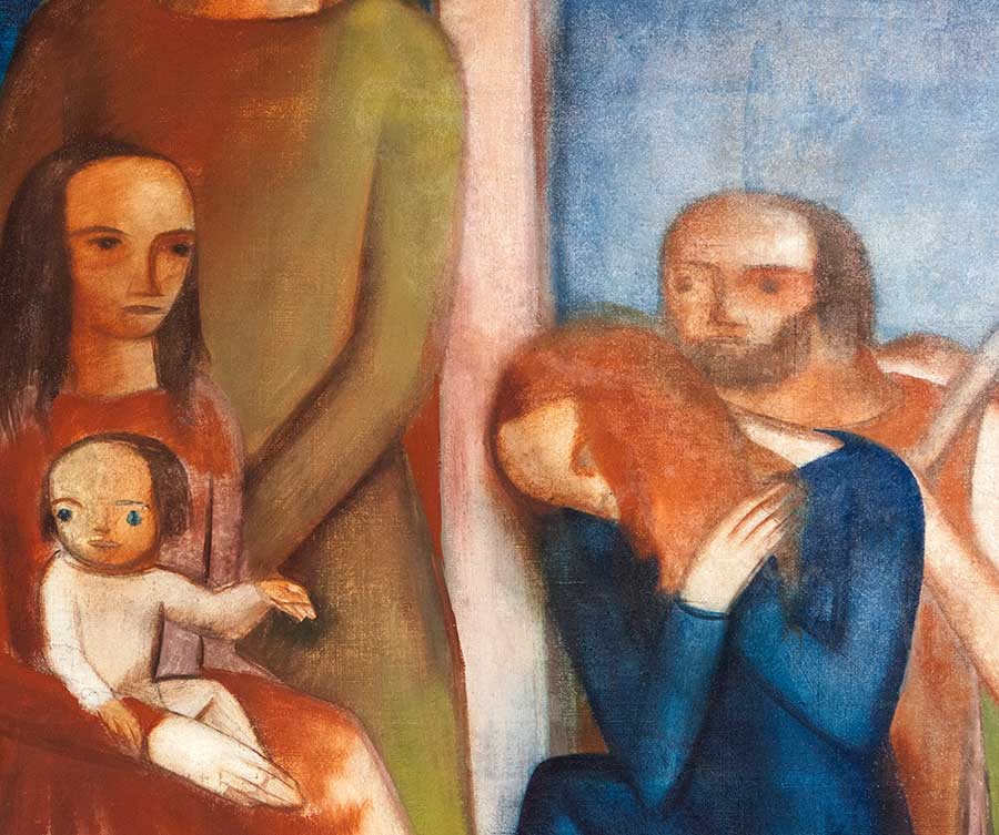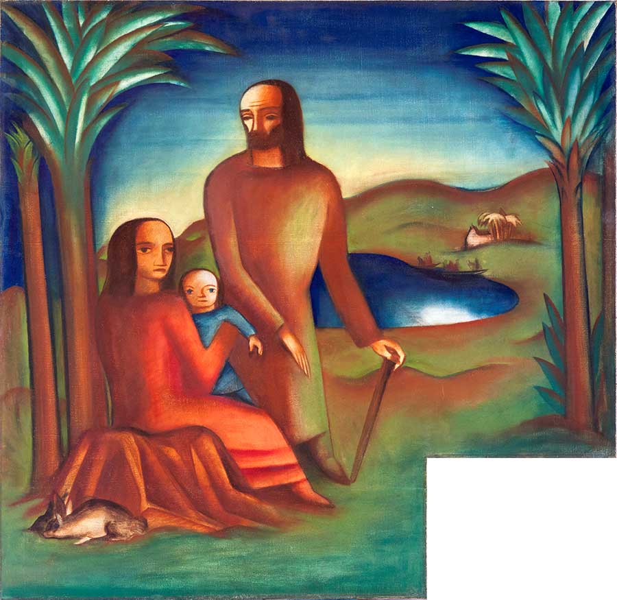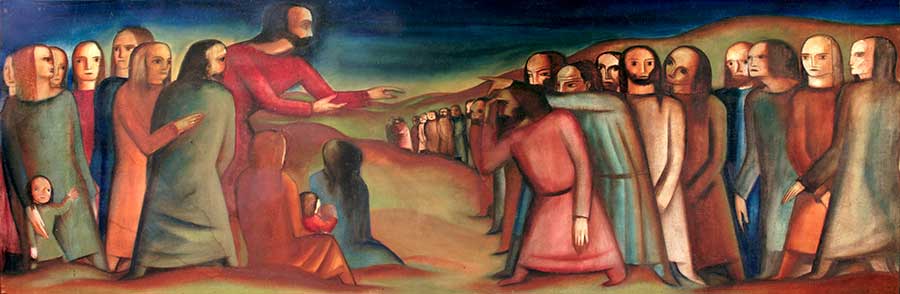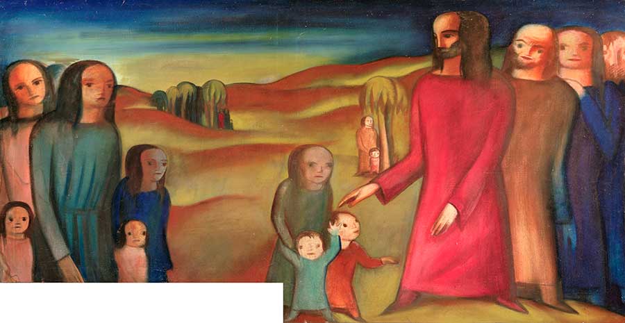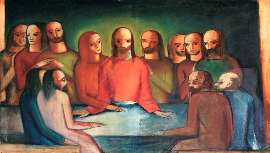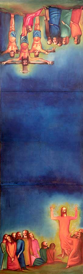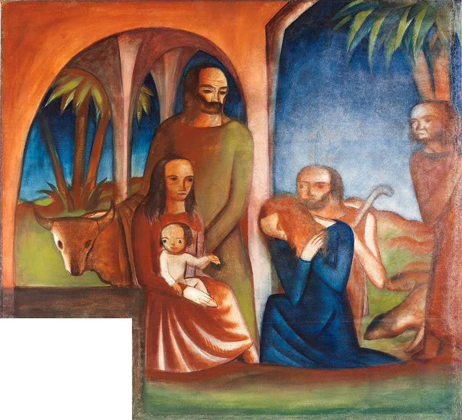 Im Mittelpunkt der Gestaltung stehen die dazu farblich kontrastierenden Deckenbilder. Sie zeigen Szenen aus dem Leben Jesu Christi. Im Mittelfeld stehen sich Kreuzigung und Himmelfahrt gegenüber. Je vier weitere Szenen aus dem Neuen Testament flankieren diese Darstellungen. Leuchtendes Lokalkolorit – Blau, Grün, Rot und tiefes Braun – prägt die Gemälde. Das tiefe Himmelsblau des Mittelfeldes findet sich in fast allen Gemälden wieder und dominiert in seiner entkörperlichten Strahlkraft den gesamten Kirchenraum. Warme Grüntöne durchziehen die landschaftlichen Bühnen der Einzelbilder, die lichten Rot- und Orangetöne sind den Gewändern vorbehalten. Auffällig sind die kontrastierenden, flächig aneinandergesetzten Farben und die überaus archaische Darstellung der Gestalten, die an die kubenhaften Gewandfiguren Giottos erinnern. Die zumeist nur durch Konturen gebauten, in lange Gewänder gehüllten Körper unterscheiden sich allein durch Haltung, Haartracht und Gesichter voneinander. Durch den radikalen Verzicht auf modisches Beiwerk und die Konzentration auf das seelische Erleben in den Gesichtern und in der Körperhaltung erlangen die Figuren eine über ihre Zeit hinausweisende Gültigkeit.↑