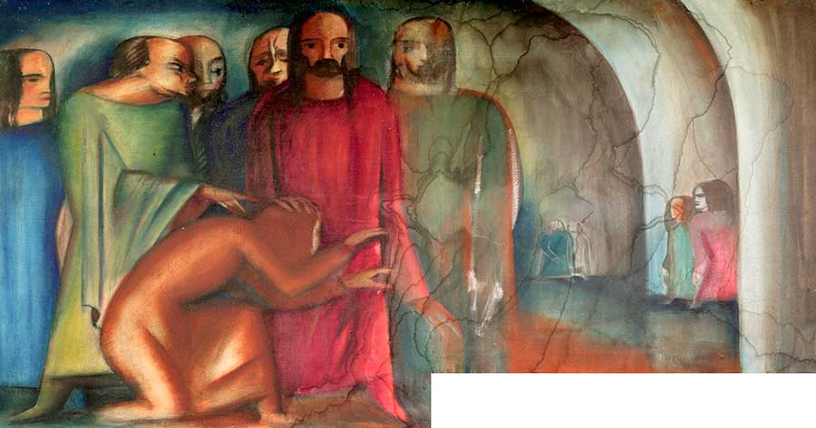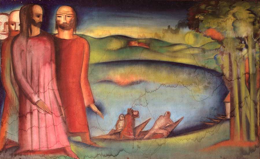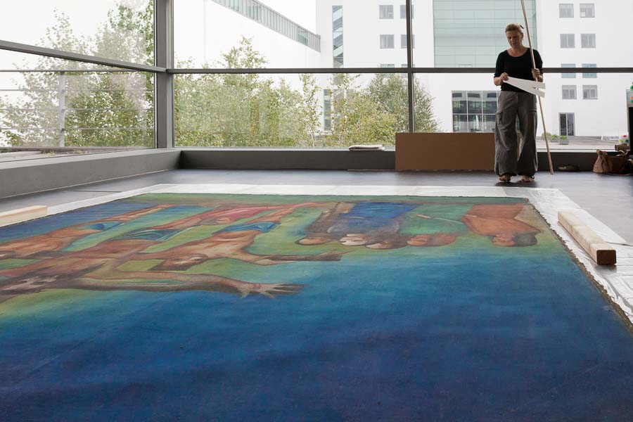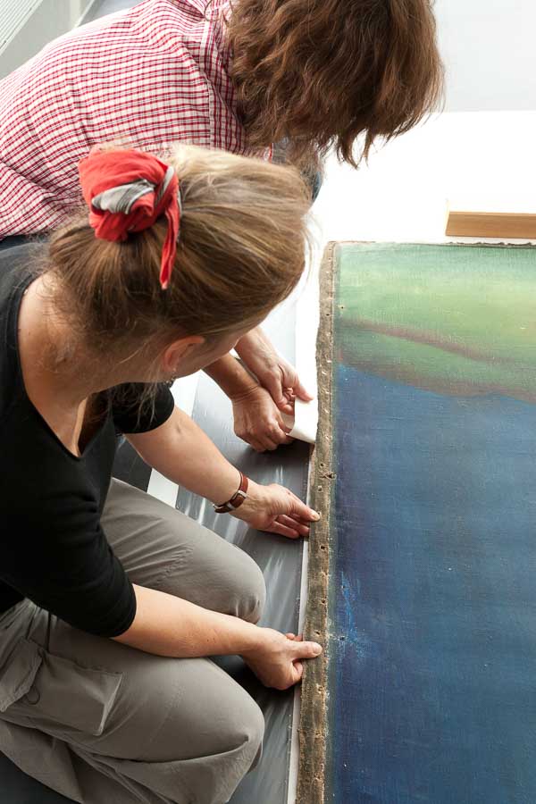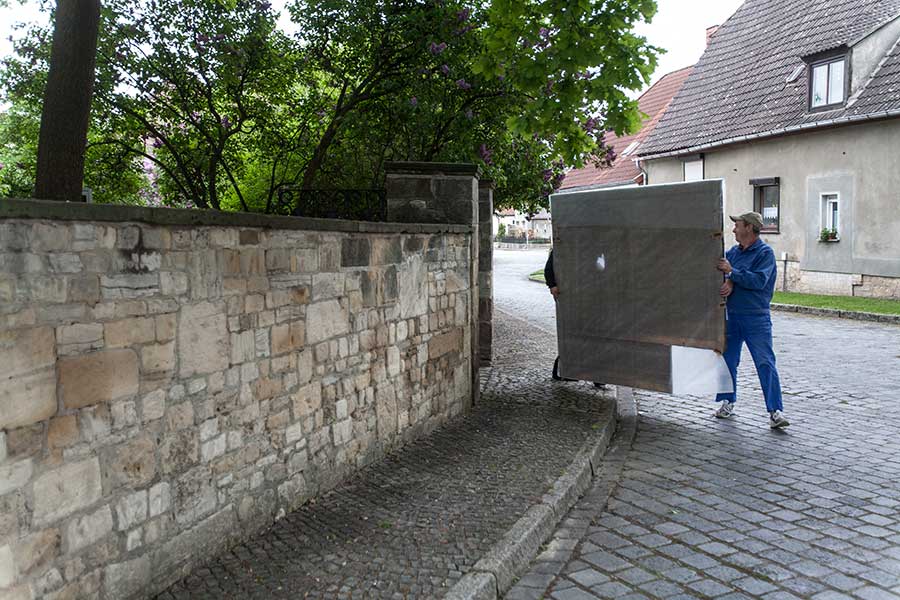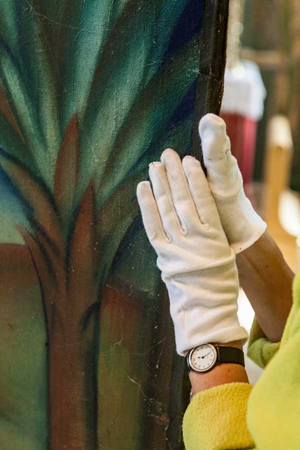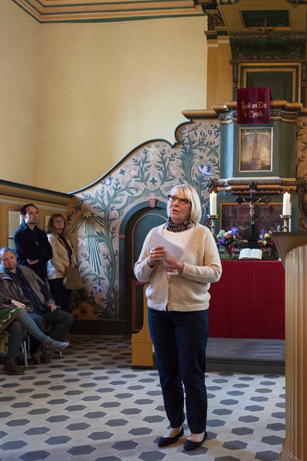 An einem warmen Herbsttag 1994 fuhren wir, Kristina Bake und ich, mit Jürgen Scharfe nach Schmirma, um uns die Deckenbilder Karl Völkers in der Dorfkirche anzusehen. Die architekturbezogenen Arbeiten des Künstlers waren für den Kunsthistoriker ein wichtiges Thema, auf das er seit unserer ersten Bekanntschaft im Jahr 1988 immer wieder zurückkam. Im April 1992 hatte er uns die bemerkenswert leichte Kuppelausmalung der Kirche in Schwenda (1938) gezeigt. In Schmirma waren wir überrascht, wie geschlossen diese Bilderfolge wirkte, wie sehr sie mit ihrer suggestiven Farbigkeit den ganzen Raum bestimmte. Das Preußischblau von Himmel und Wasser war einfach – umwerfend schön. Später besprachen wir bei einem Glas Federweißer irgendwo in der Nähe das Nötige. Unverkennbar war der schlechte Zustand dieser Leinwandgemälde, die offenbar vor allem unter den Folgen des undichten Daches gelitten hatten: Wasserränder, Leinwandlöcher und starke Verschmutzungen waren bereits von unten, noch deutlicher von den Emporen aus zu erkennen. Jürgen Scharfe erhoffte sich bei dieser Fahrt nach Schmirma meinen Rat als Restaurator. Sein Plan war es, die Bilder restaurieren zu lassen und vor ihrer Wiederanbringung in Halle, Karl Völkers Heimatstadt, auszustellen. Allerdings hatte ich keine Erfahrung mit Großformaten und hätte einen solchen Auftrag auch wegen meiner Arbeit am Museum nicht übernehmen können. Mir fiel aber meine Kommilitonin Uta Matauschek in Dresden ein, deren überlegte, umsichtige und innovative Arbeitsweise ich immer bewundert hatte. Sie war in zweifacher Hinsicht für diesen Auftrag prädestiniert: Sie hatte bei Völkers Freund und zeitweiligem Kollegen, dem Restaurator Fritz Leweke, gearbeitet und war an der Restaurierung großformatiger Leinwandbilder an der Decke beteiligt gewesen.