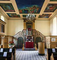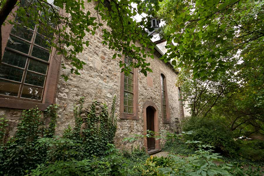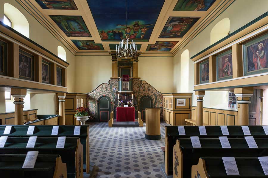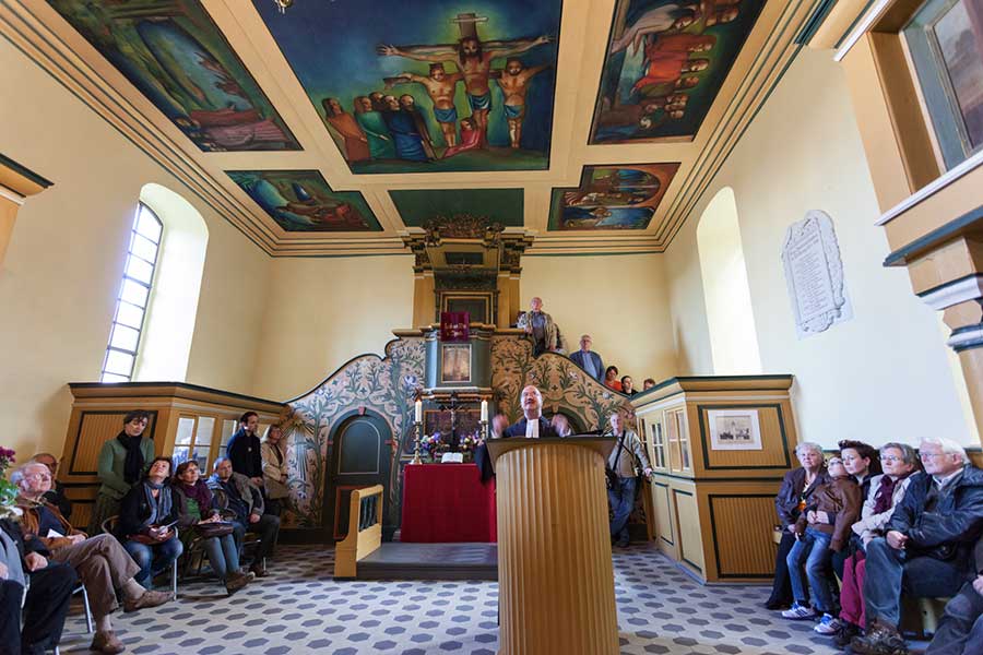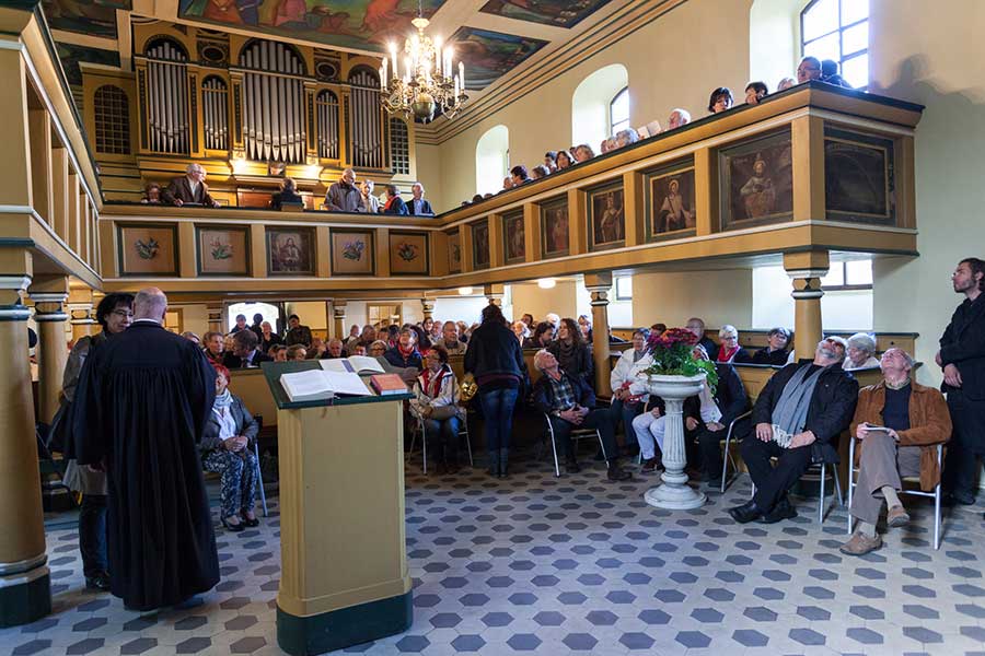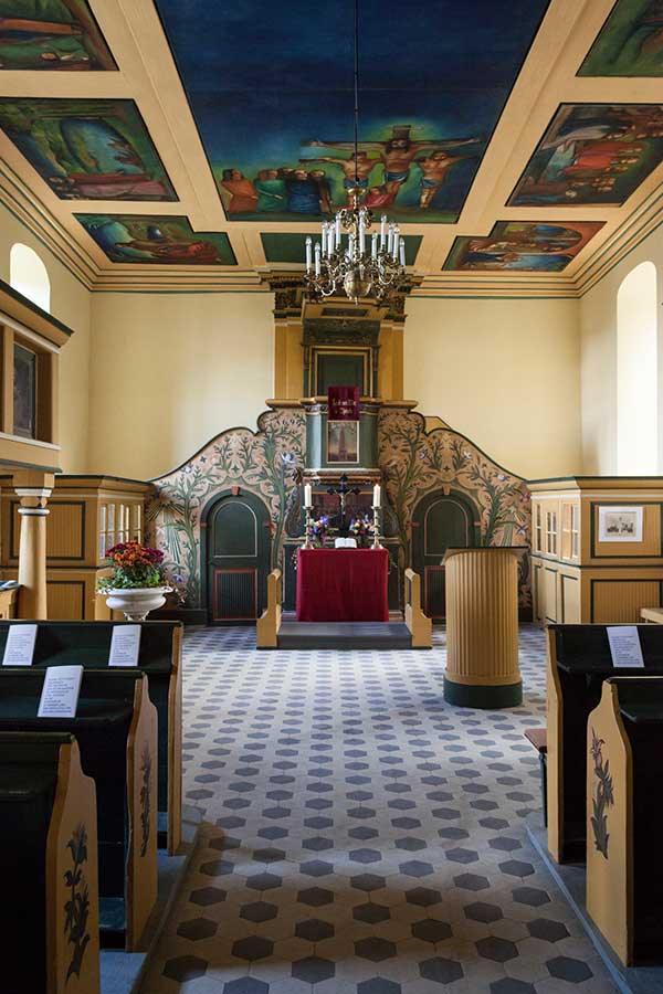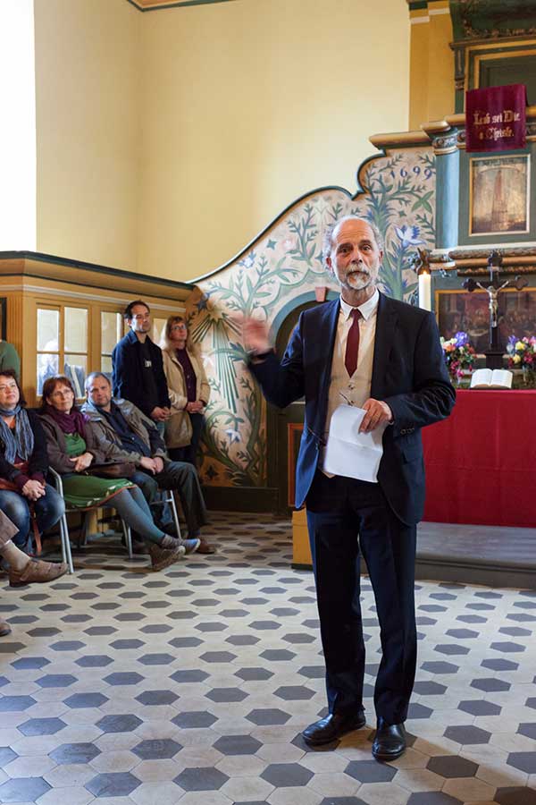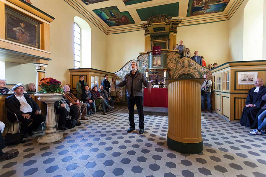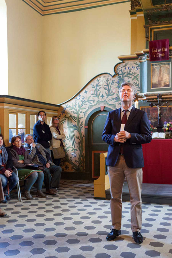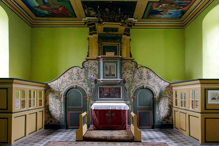 Und wie. Trotz der maigrünen Wände, die arglose Hände vor ein paar Jahren baumarktgerecht angestrichen haben, um den Raum wieder schön zu machen, ist die Harmonie überwältigend. Sie ergibt sich aus der Vollständigkeit und dem organischen Ganzen der Ansicht. Alle architektonischen Verhältnisse und die den Gottesdienst ermöglichenden Einbauten sind in die Gestaltung einbezogen. Gestühl, Empore, Orgel und Deckenrahmen sind, wie ehedem die Wände, von warmem Ocker. Die geschwungenen Wandungen, die jenen Kanzelaltar an der Stirnwand umgeben, zieren schwebende Pflanzenornamente. Das Grün, Blau und Rot aber, das einem aus den Blüten und Blättern entgegenfunkelt und sich auch an den Wangen der Bankreihen wiederfindet, erfährt ein gewaltiges Echo in der Deckenmalerei. Ich bin umhüllt vom Wohlklang reiner Komplementärfarben. Sie scheinen selbstvergessen mit sich selbst zu spielen und erfüllen den Raum mit einem alltagsfernen Licht.
