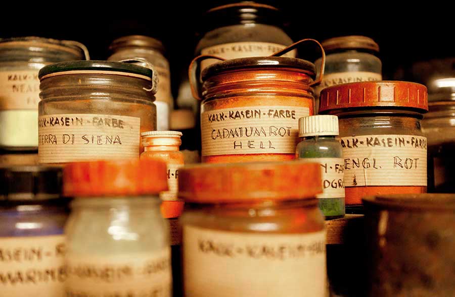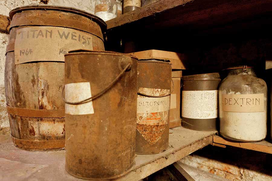 Fritz Leweke (25.1.1901–30.1.2001) hat der Nachwelt im Keller seines Hauses einen Schatz hinterlassen, der jedes Malerherz höher schlagen lässt. Historische Pigmente! Aus großen und kleinen Gläsern, aus Büchsen und Fässern leuchten sie dem Besucher ins Reich der Farbe.